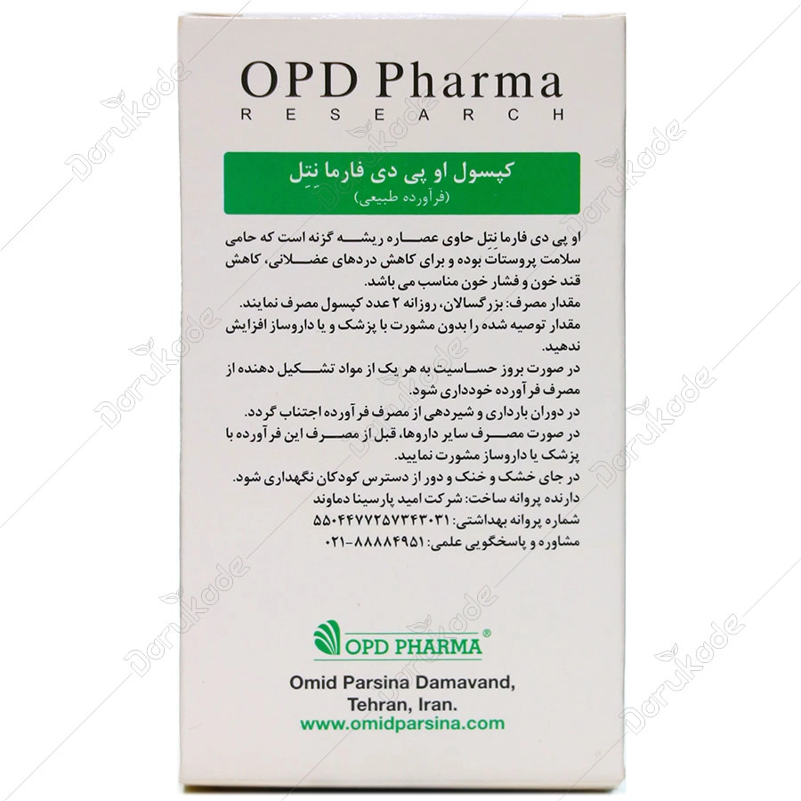 کپسول او پی دی فارما نتل حاوی عصاره ریشه گیاه گزنه می باشد که به عنوان گیاهی موثر بر سلامت پروستات در سراسر جهان شناخته شده است. هیپرپلازی خوش خیم پروستات ( BPH ) در آقایان سبب کاهش جریان ادرار ، تکرر ادرار و عدم تخلیه کامل مثانه می شود. کپسول او پی دی فارما نتل حاوی 250 میلی گرم عصاره ریشه گزنه می باشد که به عنوان یکی از درمان های BPH مطرح شده است . علاوه بر این ، عصاره ریشه گزنه سبب بهبود عملکرد مجاری ادراری کاهش قند و فشار خون و کاهش درد عضلانی نیز می شود. گزنه با نام علمی Urtica dioica گیاه علفی چندساله از تیره Urticaceae است که درکتاب های طب سنتی نیز با نام انجره کبیر ذکر شده است. نتایج تحقیقات نشان می دهد ، گزنه موجب جلوگیری از افزایش قندخون و مانع از تخریب سلول های بتای پانکراس می گردد. اثرات عصاره ریشه گزنه بر هیپرپلازی خوش خیم پروستات ایجاد شده توسط تستوسترون ، از طریق مهار آنزیم 5a-Reductase می باشد. همچنین مطالعات نشان داده است که مصرف گزنه سبب کاهش سایز بافت پروستات ، سطوح تستوسترون سرم و آنتی ژن اختصاصی پروستات ( PSA ) می شود. عصاره گزنه حاوی ترکیباتی است که مانع از اتصال پروتئین باند شونده به هورمون جنسی مردانه ( SHBG ) به گیرنده خود می شوند. گزنه از طریق اثرات ضد التهابی خود و کاهش سایتوکاین های التهابی نیز در درمان BPH موثر است.