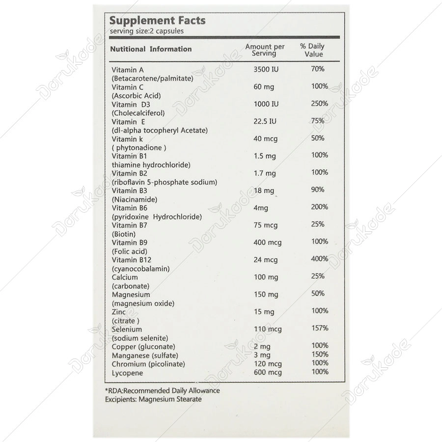 این ترکیب با داشتن موادی چون ویتامین های ث، ای وبتاکاروتن و موادی چون لیکوپن، سلنیوم، روی و مس مجموعه کاملی از آنتی اکسیدان ها را تشکیل می دهد که برای مقابله با اثرات مخرب رادیکال های آزاد در بدن لازم و ضروری هستند و ضمن افزایش سلامت عمومی بدن از بیماری های قلبی-عروقی، سرطان، دیابت، عفونت، التهاب و پیری زودرس جلوگیری می کنند. لیکوپن آنتی اکسیدانی است که خطر ابتلا به سرطان پروستات را کم می کند.سلنیوم با افزایش تولید و حرکت اسپرم نقش موثری در افزایش قدرت باروری آقایان ایفا می کند.ویتامین ای با خاصیت ضد انعقادی خود به جریان راحت خون در رگها کمک کرده و از بروز سکته های قلبی و مغزی جلوگیری می کند.منیزیم عنصری در تولید انرژی است که گرفتگی های عضلانی را کاهش می دهد و از احساس ضعف و خستگی جلوگیری می کند.کروم با تنظیم قند خون به پیشگیری از دیابت و کنترل آن کمک زیادی می کند. کلسیم موجود در فرآورده نقش موثری در استحکام استخوان ها و دندان ها ایفا می کند.ویتامین دی و منیزیم موجود در فرآورده به جذب کلسیم بسیار کمک می کنند.این مکمل با داشتن 15 میلی گرم زینک المنتال و ویتامین های گروه ب نقش ویژه ای در سلامت پوست و مو ایفا می کند. همچنین روی به همراه ویتامین ث باعث افزایش کارایی سیستم ایمنی بدن و جلوگیری از بروز بیماری می شود.