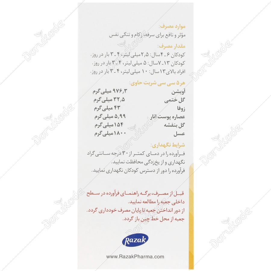 موارد منع مصرف: مصرف این فرآورده در کودکان کمتر از چهار سال، همچنین به علت وجود عسل در فراورده در افراد مبتلا به عدم توانایی هضم فروکتوز ممنوع می باشد. در بیماران مبتلا به نارسایی کبد و صرع در بیماران مبتلا به ضایعات مغزی، منحصرا پس از مشورت با پزشک مورد مصرف قرار گیرد.