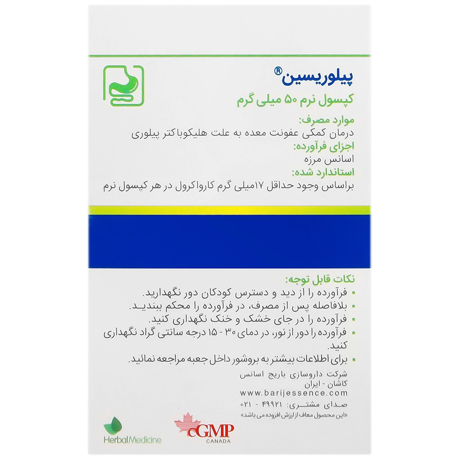 بر اساس نتایج یک کارآزمایی بالینی برای درمان هلیکوباکترپیلوری با امپرازول 20 میلی گرم دوبار در روز + آموکسی سیلین 1 گرم دو بار در روز + کلاریترومایسین 500 میلی گرم دو بار در روز + کپسول نرم پیلوریسین 2 بار در روز/ یا دارونما 2 بار در روز به مدت 14 روز، میزان موفقیت در ریشه کنی هلیکوباکتر پیلوری در گروه پیلوریسین به شکل معنی داری بیشتر بود. همچنین از نظر عوارض جانبی اختلاف معنی داری بین دو گروه مشاهده نشد. محققین نتیجه گرفتند کپسول نرم پیلوریسین بر ریشه کنی عفونت هلیکوباکترپیلوری موثر بوده و بدون بروز عارضه منجر به کاهش علائم بالینی بیماری نیز می شود.