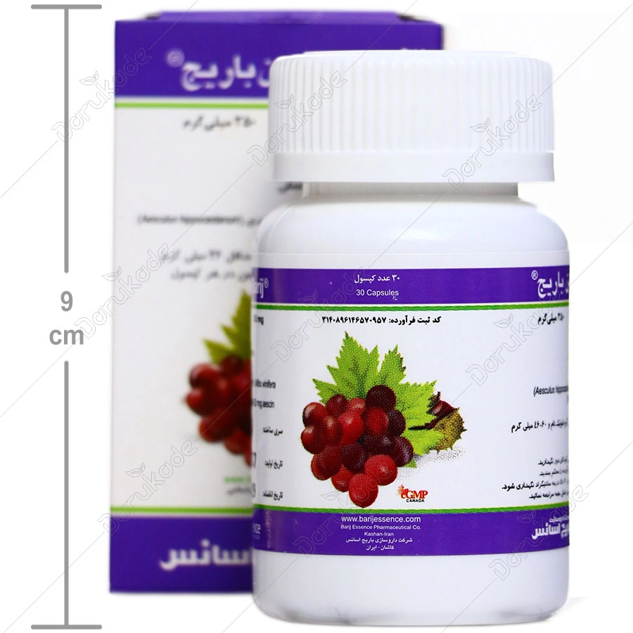 آثار فارماکولوژیک و مکانیسم اثر: وریدهای واریسی، وریدهای متسع مارپیچی هستند که به طور شایعی روی اندام تحتانی مشاهده میشوند. فاکتورهای خطر واریسی شدن وریدها عبارتند از: سرفه مزمن، یبوست، سابقه خانوادگی بیماریهای وریدی، جنس مؤنث، چاقی، کهنسالی، بارداری و ایستادن طولانی. پاتوفیزیولوژی اصلی واریس مورد بحث است اما استعداد ژنتیکی، بیکفایتی دریچهها، ضعف دیواره عروق و افزایش فشار داخل وریدی در این امر دخالت دارد. نشانههای واریسی بودن وریدها عبارتند از: احساس سنگینی و درد، خارش یا سوزش و بدتر شدن علائم به دنبال ایستادن طولانی. عوارض بالقوه وریدهای واریسی شامل عفونت، زخم ناحیه پا، تغییرات ناشی از توقف جریان خون (استاز) و ترومبوز میباشد. بعضی از انتخابهای درمانی مرسوم عبارتند از: اجتناب از ایستادن طولانی و خستگی، بالا نگهداشتن اندام مبتلا، ورزش، اعمال فشار از بیرون، درمان طبی، تعدیل فاکتورهای خطر قلبیعروقی، کاهش ورم محیطی و کاهش وزن. با این وجود درمانهای تهاجمیتری نیز وجود دارند مانند لیزر، اسکلروتراپی و جراحی. انتخاب نوع درمان به فاکتورهای متعددی از جمله علائم بیمار، ترجیح بیمار، هزینه و مهارت پزشک بستگی دارد. نارسایی مزمن وریدی (CVI) عمدتاً ناشی از هایپرتانسون وریدی و کاپیلری ثانویه به اختلال در برگشت وریدی است که موجب استاز وریدی پایدار و مزمن در پوست اندام تحتانی میشود که با تغییر وضعیت به طور شاخص خود را نشان میدهد. در بررسی اثر عصاره دانه انگور بر اختلالات مقاومت مویرگی در بیماران مبتلا به فشار خون بالا و دیابت، مقدار 150 میلیگرم عصاره دانه انگور در روز به خوبی تحمل شده و مقاومت مویرگها به طور قابل توجهی بهبود یافته است. در یک مطالعه باز به منظور ارزیابی اولیه ایمنی مصرف و تحمل شاه بلوط هندی در درمان نارسایی مزمن وریدی، بیماران به مدت 8 هفته روزی 2 بار هر بار یک قرص 50 میلیگرمی شاه بلوط هندی را مصرف نمودند. در ویزیتهای دوم و سوم، بیماران تحمل مصرف دارو را خوب و نسبتاً خوب (به ترتیب در 90 و 95 درصد موارد) بیان کردند. تفاوت مقدار متوسط علائم مورد بررسی قبل از شروع درمان با ویزیت سوم از نظر آماری قابل توجه بود و محیط مچ پا و قسمت تحتانی پا کاهش یافته بود. اکثر بیماران اثربخشی دارو را خیلی خوب یا خوب گزارش کردند. نتایج این بررسی نشان داد که قرص 50 میلیگرمی شاه بلوط هندی برای مرحله I وII طبقهبندی ویدمر نارسایی مزمن وریدی، مؤثر و مصرف آن ایمن بوده و به خوبی تحمل میشود. دانه انگور به عنوان منبع پرو آنتوسیانیدین های اولیگومریک (OPCs) و در عمل به عنوان جایگزینی برای پیکنوژنول مورد استفاده قرار میگیرد. در یک مطالعه، مصرف روزانه 45 میلیگرم OPCs انگور علائم CVI به ویژه سنگینی اندام تحتانی را در 108 بیمار کاهش داده است. در یک مطالعه دوسوکور با کنترل دارونما روی 219 بیمار مبتلا به CVI، مصرف روزانه 360 یا 720 میلیگرم از عصاره برگ انگور در کاهش اِدِم، تسکین درد و سایر علائم بیمار به طور قابل توجهی موثرتر از دارونما بود و محققین اعلام کردند بهبودی ناشی از مصرف 720 میلیگرم در روز کمی بیشتر و پایدارتر بوده است. در این مطالعه عوارض جانبی عمدتاً به صورت دیسترس گوارشی خفیف و گاهی سردرد بود و آزمایشات خون و معاینه فیزیکی تاثیر سویی را نشان نداد. در مطالعه دیگری روی 39 بیمار مبتلا به CVI، با مصرف 360 میلیگرم عصاره برگ انگور منقسم در دو نوبت در روز، بعد از 2 هفته درمان، بهبود قابل توجه در کرایتریای بیماران و حجم اندام تحتانی مشاهده شد. همچنین در یک مطالعه متقاطع روی 71 بیمار مبتلا به CVI، مصرف روزانه 360 میلیگرم عصاره برگ انگور موجب کاهش اندازه محیط اندام تحتانی و افزایش میزان جریان خون میکرووسکولار شده است. ترکیب شاه بلوط هندی و دانه انگور، یک آنتیاکسیدان منحصر به فرد است که سلامت وریدها، مویرگها و سیستم گردش خون را موجب میشود. آئسین (ماده مؤثره شاه بلوط هندی) موجب استحکام وریدها و جلوگیری از نشت مایع به خارج از عروق خونی و در نتیجه پیش