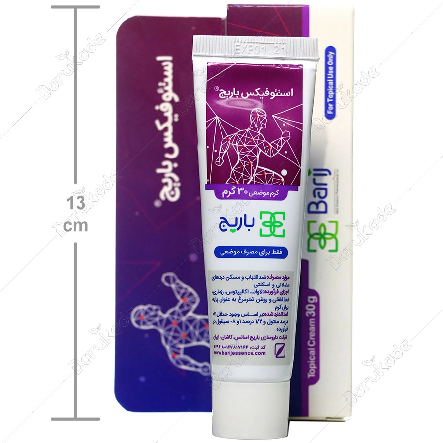 بصورت سنتی استفاده موضعی به همراه ماساژ و یا به صورت آروماتراپی از فرآورده های حاوی گیاه لاواند و اکالیپتوس جهت التیام درد و التهاب رواج دارد. 1 و 8-سینئول ( اکالیپتول ) ، مهم ترین ترکیب گیاه اکالیپتوس ، تولید فاکتورهای التهابی را در بدن مهار کرده و منتول آن نیز به همراه اسانس رزماری میزان بروز دردهای عضلانی ، اسکلتی و مفصلی را کاهش می دهد. مطالعات نشان داده که مصرف موضعی فرآورده های حاوی نعنا و رزماری علاوه بر اثر تسکین درد و التهاب می تواند تورم ناشی از آن را التیام بخشد. مطالعات نشان داده که مصرف موضعی روغن شترمرغ در طولانی مدت تاثیر قابل توجهی در کاهش دردهای عضلانی و اسکلتی دارد. کرم موضعی استئو باریج با بهره گیری از ترکیبات طبیعی اثرات چشمگیری در بهبود التهاب و دردهای عضلانی ، اسکلتی و مفصلی داشته و همچنین در برطرف کردن تورم ناشی از این آسیب ها موثر می باشد.