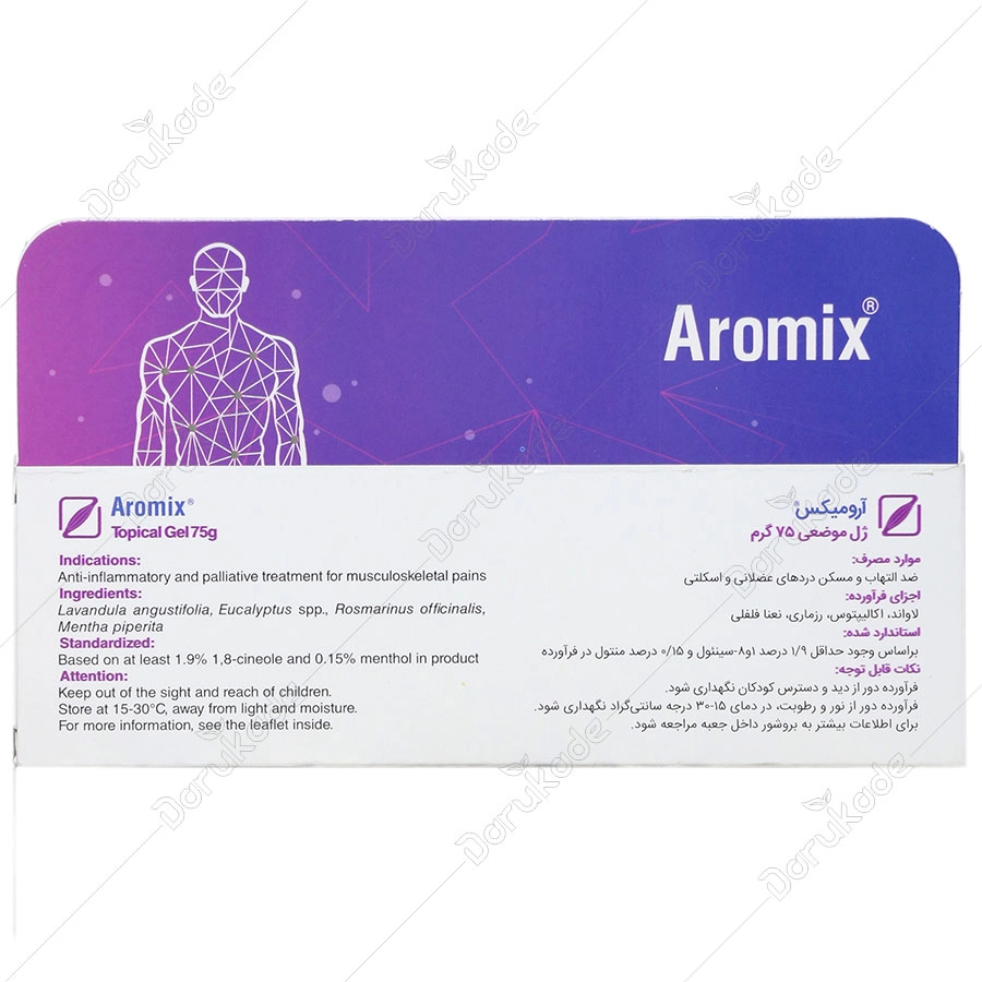 مسکن های موضعی می توانند نقش مهمی را مدیریت درمان درد ایفا نموده و گیاهان زیادی نیز واجد اثرات ضد درد و ضد التهاب هستند. به صورت سنتی استفاده موضعی به همراه ماساژ و یا به صورت آروماتراپی از فرآورده های حاوی گیاه لاواندا و اکالیپتوس جهت التیام درد و التهاب رواج دارد. 1 و 8-سینئول (اکالیپتول)، مهم ترین ترکیب گیاه اکالیپتوس، تولید فاکتورهای التهابی را در بدن مهار کرده و منتول آن نیز به همراه اسانس رزماری میزان بروز دردهای عضلانی، اسکلتی و مفصلی را کاهش می دهد. مطالعات نشان داده که مصرف موضعی فرآورده های حاوی نعنا و رزماری علاوه بر تسکین درد و التهاب می تواند تورم ناشی از آن را التیام بخشد. ژل موضعی آرومیکس باریج با بهره گیری از ترکیبات طبیعی اثرات چشمگیری در بهبود التهاب و دردهای عضلانی، اسکلتی و مفصلی داشته و همچنین در برطرف کردن تورم ناشی از این آسیب ها موثر می باشد.