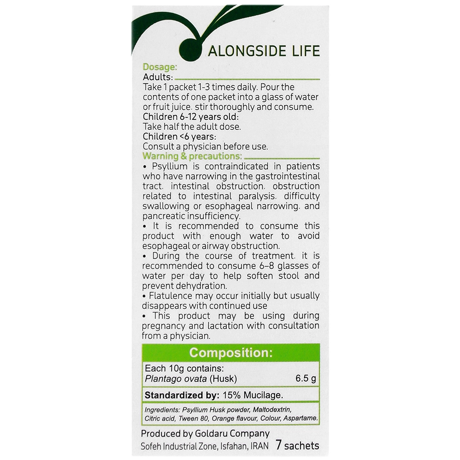 هر ساشه 10 گرمی حاوی 6.5 گرم پوست دانه اسفرزه استاندارد شده بر حسب 15% موسیلاژ