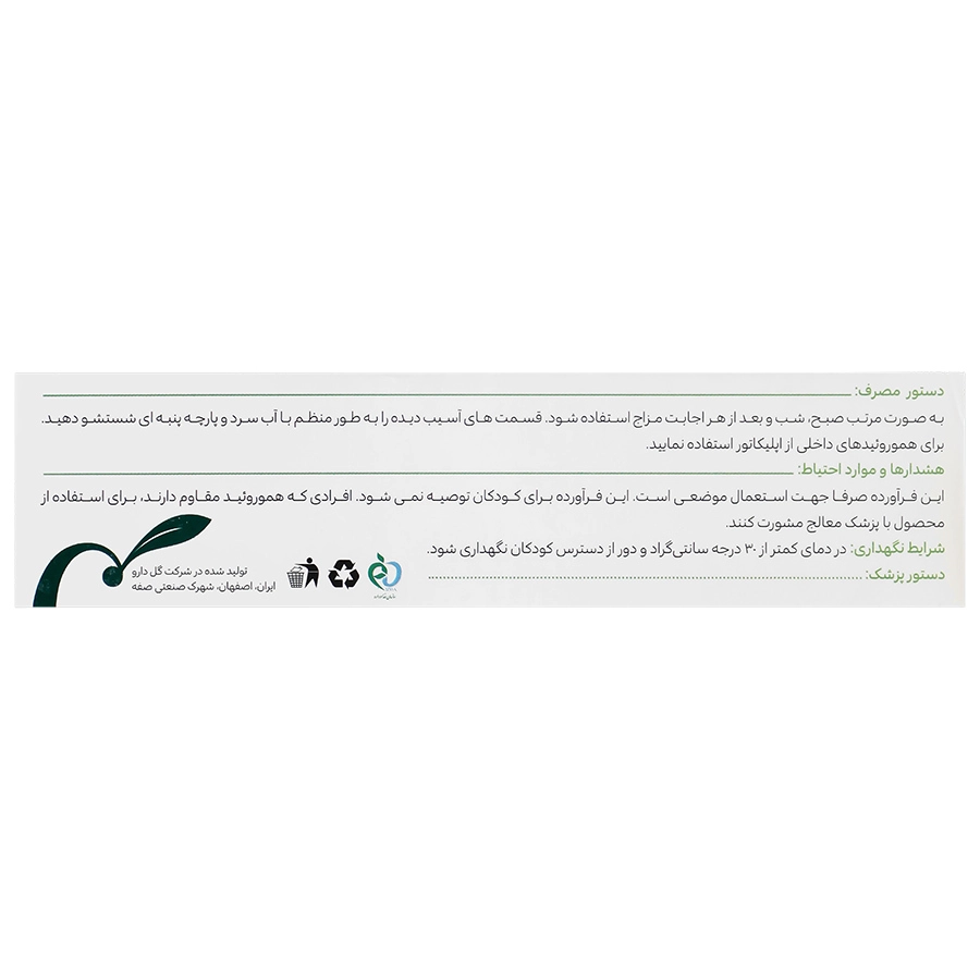 به صورت مرتب صبح، شب و بعد از هر اجابت مزاج استفاده شود. قسمت های آسیب دیده را به طور منظم با آب سرد و پارچه ای پنبه ای شستشو دهید. برای هموروئید های داخلی از اپلیکاتور استفاده نمایید. .