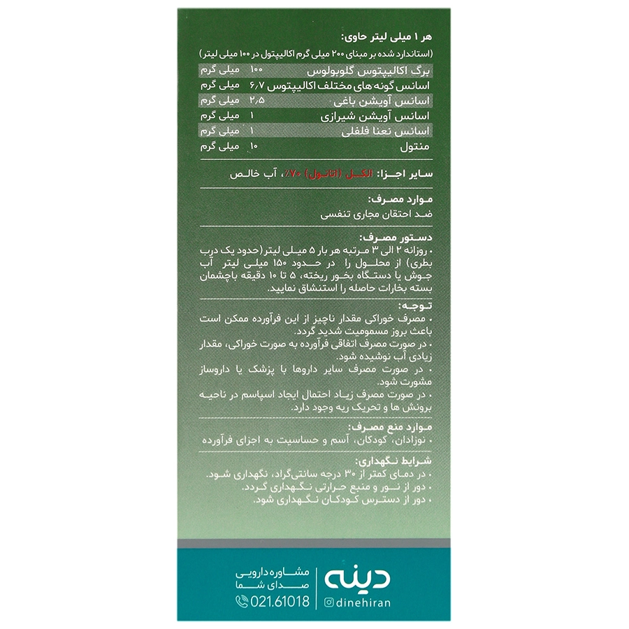 منع مصرف: فرآورده های حاوی اسانس نعنا و اسانس اکالیپتوس برای استنشاق نوزادان و کودکان منع مصرف دارد. در صورت آسم و حساسیت به اجزاء فرآورده استفاده نشود.