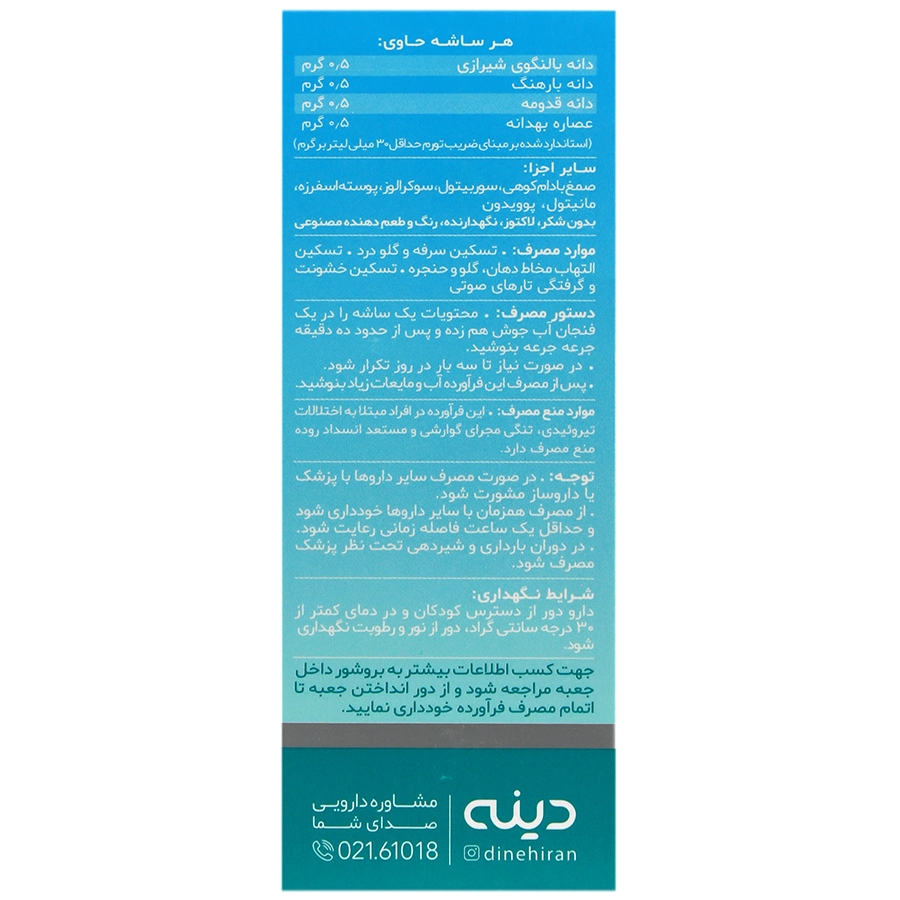 اين محصول، مخلوطی از چهار دانه موسیلاژی است که دم کرده آن برای درمان سرفه و التیام التهاب و درد گلو و دهان به کار می رود. ترکیبات موسیلاژی با خواص التیام بخشی، محافظت کنندگی و نرم کنندگی، باعث کاهش تحریکات مخاط و تسکین التهاب می شوند. هیچیک از دانه ها در این فرآورده پودر نمی شوند و بنابراین به طور ایمن، اثر بخشی آن ها فقط از طریق ترکیبات موسیلاژی دانه های کامل بدست می آید. در این فرآورده، نگرانی ناشی از ترکیبات سیانیدی دانه های پودر شده به، وجود ندارد زیرا عصاره موسیلاژی دانه کامل پودر نشده به، جایگزین بهدانه پودر شده در فرمول شده است. از مزایای دیگر این فرآورده آن است که فاقد شکر است و بنابراین برای افراد دارای رژیم های با محدودیت مصرف قند مثل افراد دارای اضافه وزن و یا بیماران دیابتی قابل مصرف است.