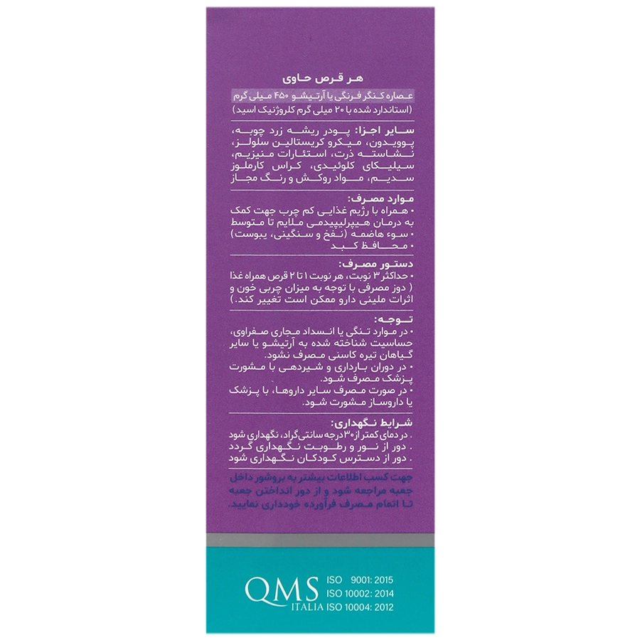 موارد منع مصرف: در موارد تنگی یا انسداد مجاری صفراوی، حساسیت شناخته شده به آرتیشو یا سایر گیاهان تیره کاسنی مصرف نشود.