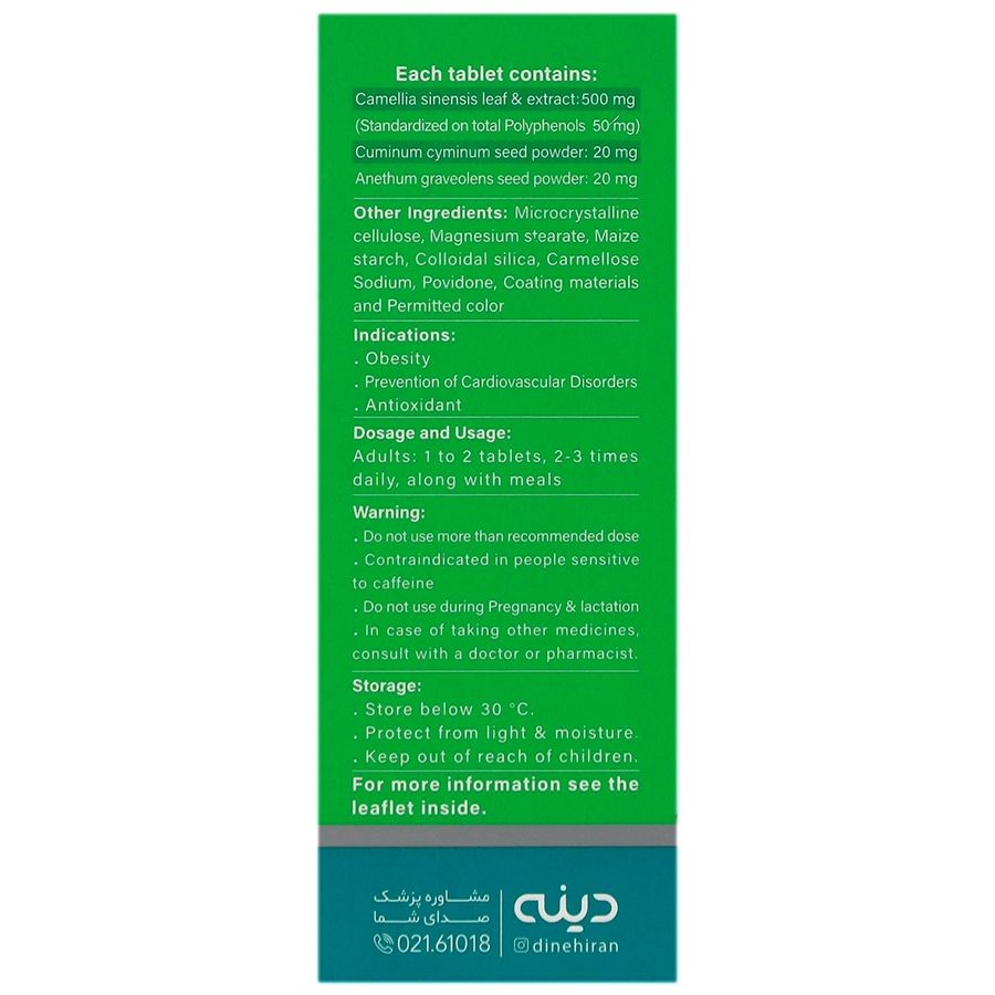 عوارض جانبی: در دوز معمولی عارضه جانبی خاصی مشاهده نمی گردد اما مصرف زیادتر از حد مجاز، ممکن است باعث بی قراری، تحریک پذیری، بیخوابی، سردرد، سرگیجه و تپش قلب گردد. در افراد حساس، عوارض گوارشی مانند افزایش اسید معده، تحریک معده، کاهش اشتها، اسهال یا یبوست با مصرف چای سبز گزارش شده است. جهت رفع عوارض گوارشی به فرمول فرآورده، زیره سبز و شوید اضافه شده است. مصرف شیر نیز همراه با این قرص جهت کاهش عوارض موثر است . در صورت حساسیت به مصرف چای در به خواب رفتن، از مصرف آن به هنگام شب خودداری گردد.