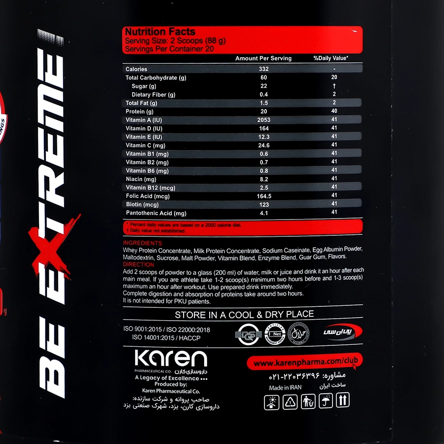 • حاوی 22% پروتئین از مخلوط پروتئین های شیر و Whey