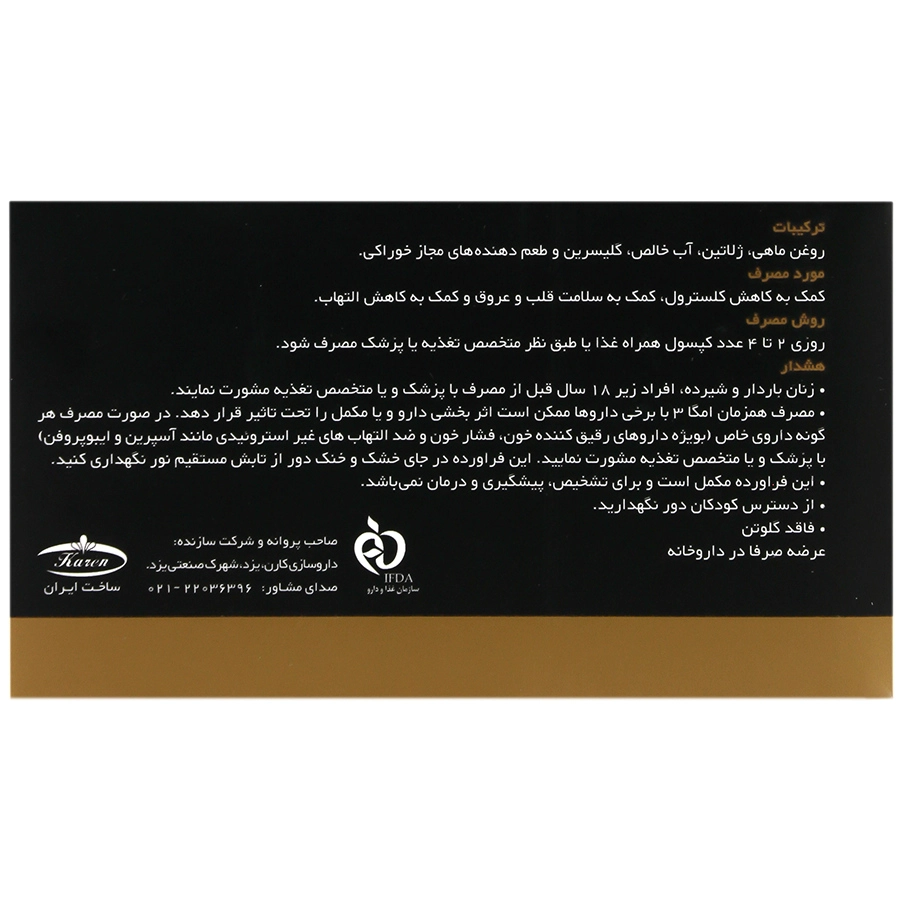 ترکیبات: روغن ماهی، ژلاتین، گلیسیرین، طعم دهنده های مجاز خوراکی، فاقد گلوتن.
