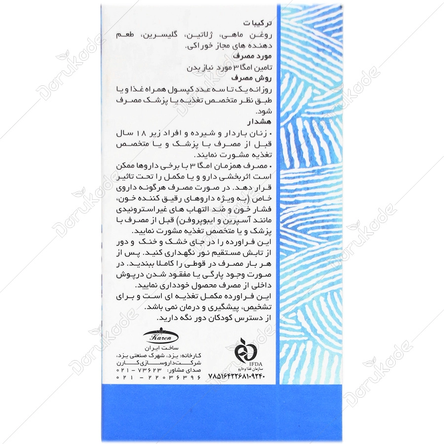 هر کپسول حاوی 1000 میلی گرم روغن ماهی، 150 میلی گرم EPA و 500 میلی گرم DHA