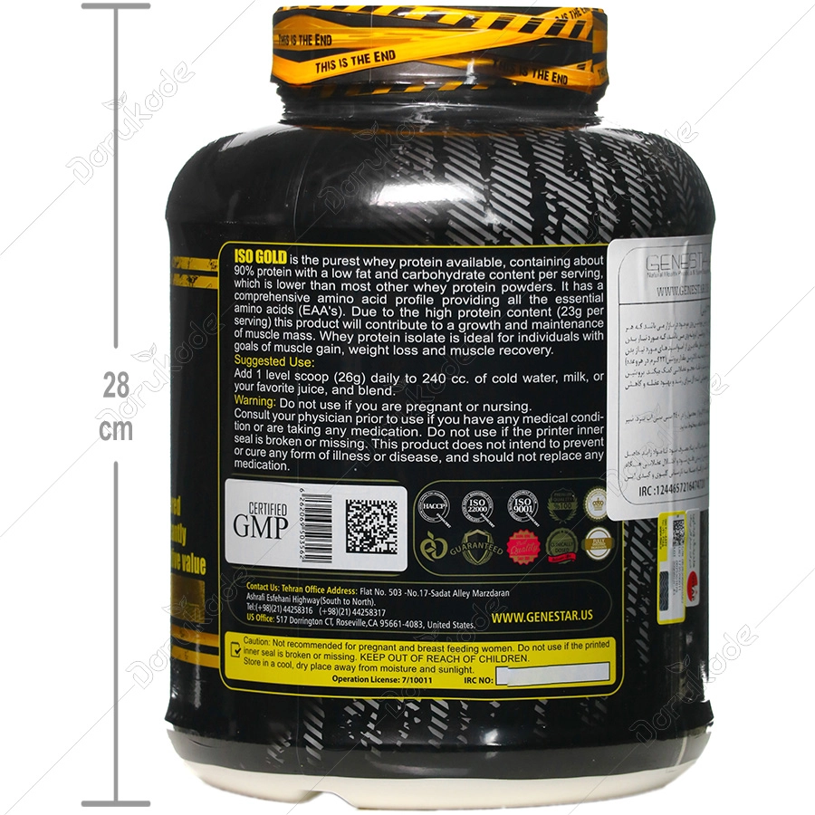 ایزو گلد خالص ترین پروتئین وی موجود در بازار می باشد که هر وعده آن شامل 90% پروتئین ایزوله وی می باشد، که مورد نیاز بدن نیز است. این محصول شامل مقادیری از آمینواسیدهای مورد نیاز بدن نیز می باشد. با توجه به بالاترین مقدار پروتئین (23 گرم در هر وعده) این محصول به رشد و بقاء حجم عضلانی کمک می کند. پروتئین ایزوله شده وی محصولی ایده آل برای رشد و بهبود عضله و کاهش وزن می باشد.