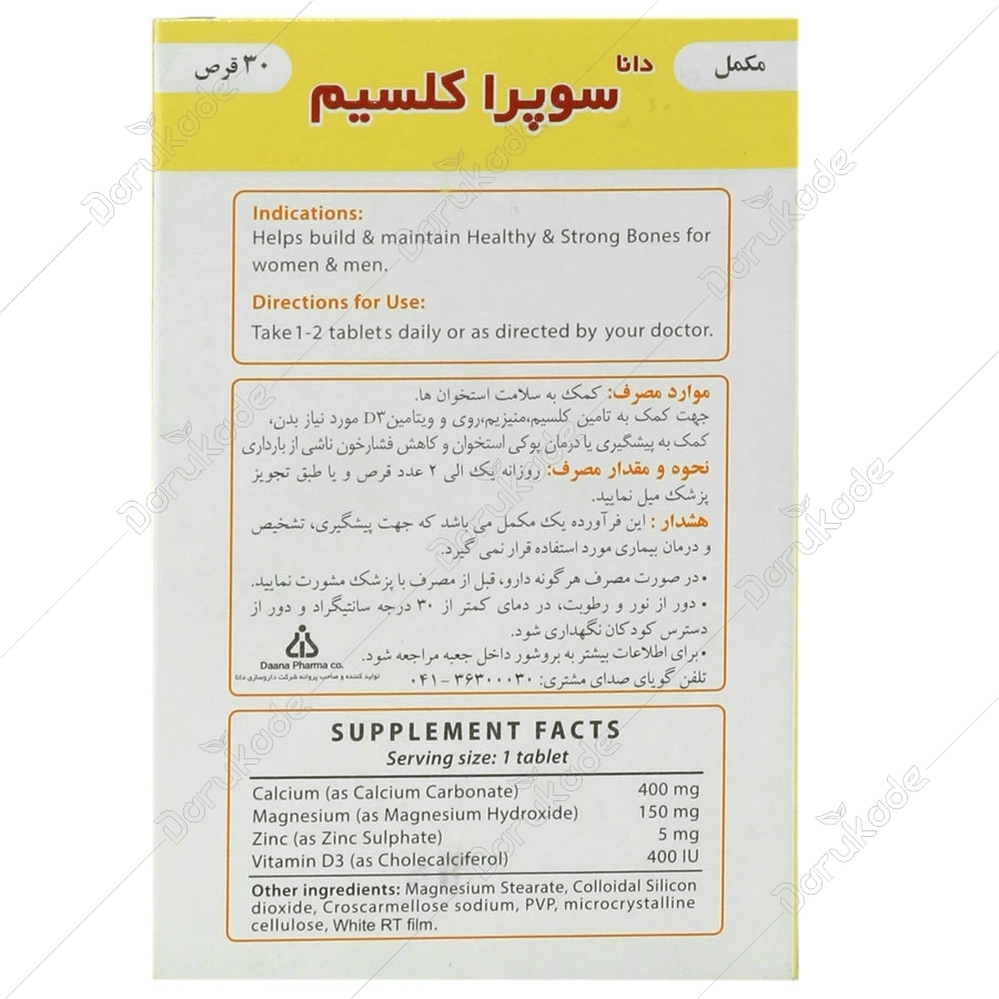مکمل دانا سوپرا کلسیم جهت کمک به تامین کلسیم، منیزیم، روی و ویتامین د3 مورد نیاز بدن و نیز کمک به پیشگیری یا درمان پوکی استخوان و کاهش فشار خون ناشی از بارداری، مورد استفاده قرار می گیرد.