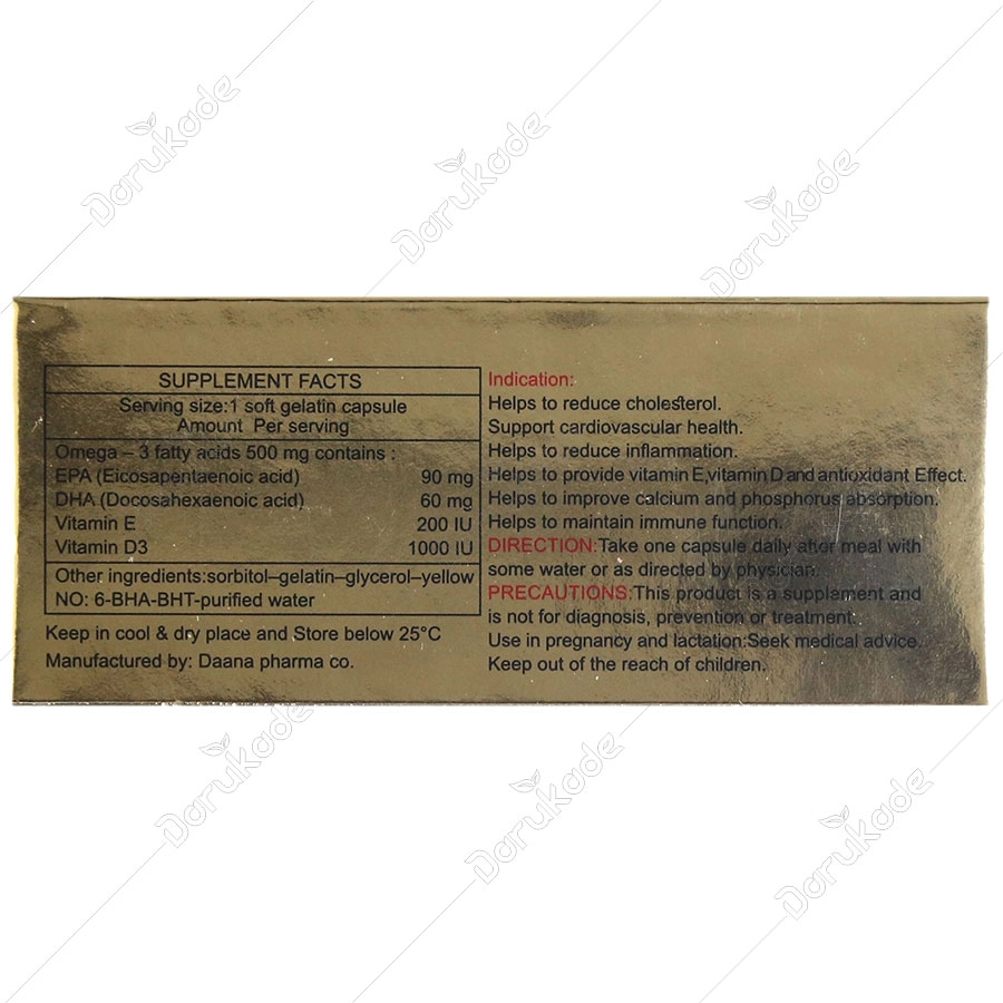 هر قرص حاوی 500 میلی گرم امگا 3، 1000 واحد ویتامین D3 و 200 واحد ویتامین E
