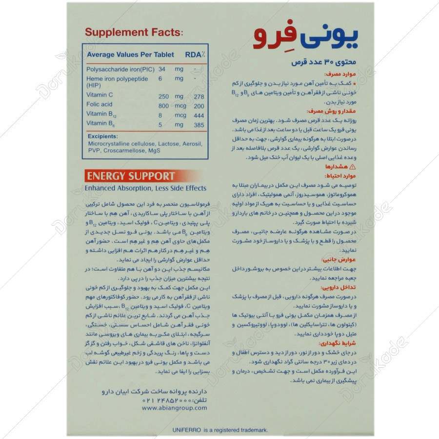 این مکمل جهت کمک به بهبود و جلوگیری از کم خونی ناشی از فقر آهن به کار می رود. حضور کوفاکتورهای مهم ویتامین C، فولیک اسید و ویتامین B12 سبب افزایش جذب آهن می گردند. شایع ترین علائم ناشی از کم خونی فقر آهن شامل احساس سستی، خستگی، سرگیجه، ابتلای مکرر به بیماری های ویروسی مانند آنفلوانزا، ناخن های قاشقی شکل، خواب رفتن و گزگز دست و پاها، رنگ پریدگی و زخم غیرطبیعی گوشه لب می باشد و مکمل یونی فرو در بهبود این علائم نقش بسزایی را ایفا می نماید.