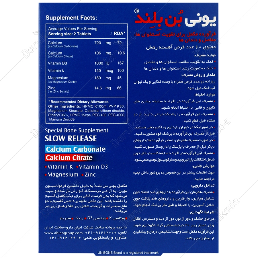فرمولاسیون آهسته رهش قرص Unibon blend به این معنا است که این قرص به آرامی در دستگاه گوارش باز شده و سبب میشود که بدن فرصت کافی برای جذب کامل کلسیم را داشته باشد و تمام کلسیم مورد نیاز روزانه بدن تامین گردد.