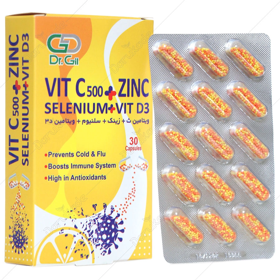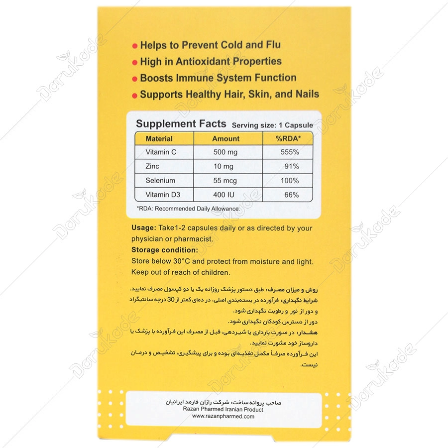 حاوی 500 میلی گرم ویتامین ث، 10 میلی گرم زینک، 55 میکروگرم سلنیوم و 400 واحد ویتامین د3 در هر کپسول