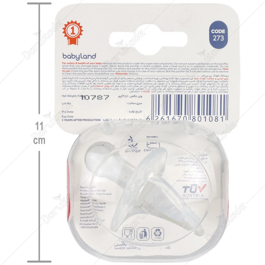 پستانک فندقی بیبی لند کد 273 تهیه شده از مواد کاملا بهداشتی و طراحی شده بر اساس شکل طبیعی کام و لثه کودک بوده و مانع از تغییر فرم بینی کودک میشود. سری این پستانک به صورت گرد و از جنس سیلیکون خالص و بی ضرر است. طراحی این پستانک به گونه ای است که متناسب با خطوط صورت نوزاد بوده و مکیدن را برای آن آسان میکند و از تغییر فرم بینی جلوگیری میکند.