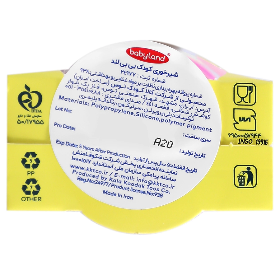 شیرخوری ارتودنسی بی بی لند از مواد اولیه مرغوب، شفاف و سبک پلی پروپیلن با گرید بهداشتی تولید شده است. سرشیشه ارتودنسی با سر شیب دار و منطبق با زبان و لثه کودک، از رشد نامناسب دندان و فک کودک جلوگیری کرده و به مکیدن آسان وی کمک میکند.