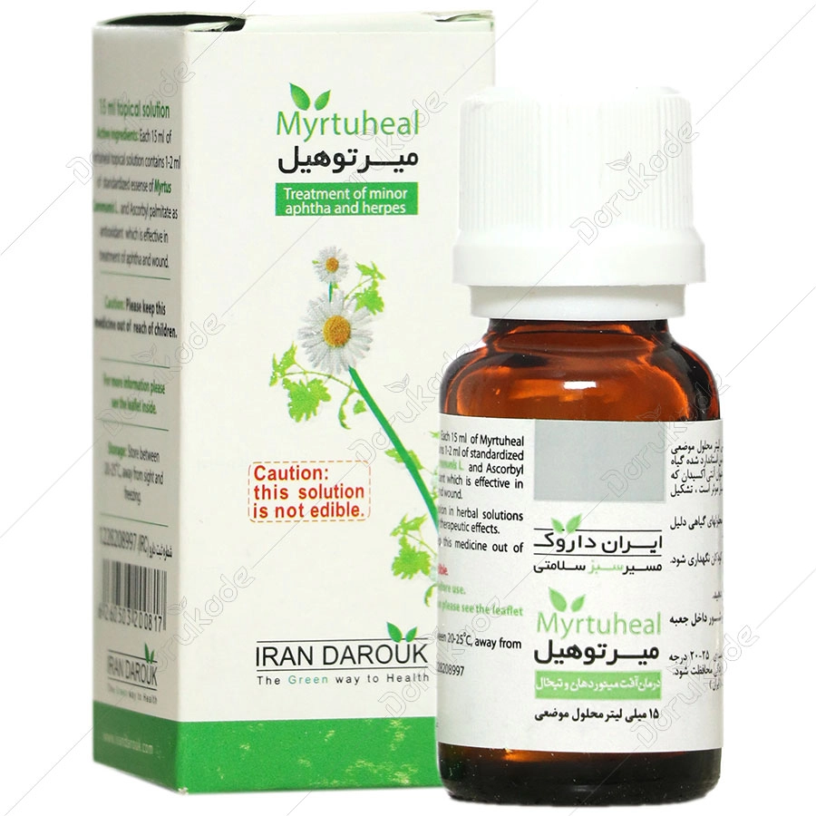 هر 15 میلی لیتر محلول موضعی میرتوهیل از 2-1 میلی لیتر اسانس گیاه مورد و نیز آسکوربیل پالمیتات استاندارد شده است.