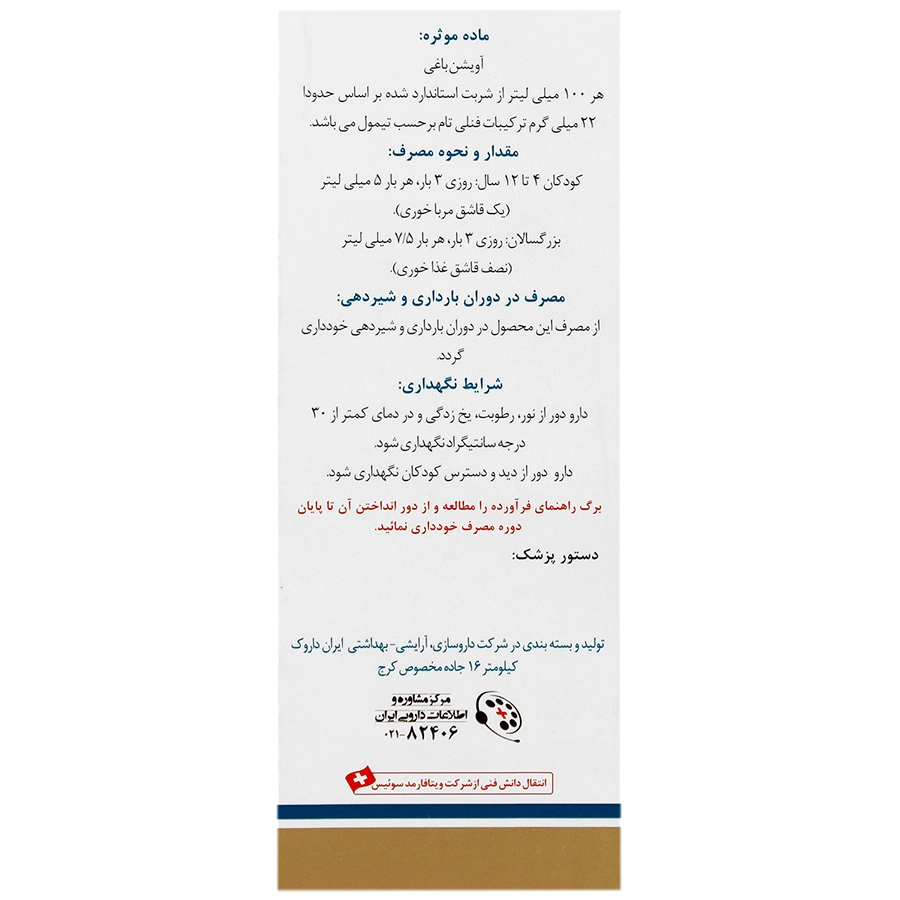 توجه: شیشه دارو را قبل ازمصرف به خوبی تکان دهید. وجود رسوب احتمالی در محلول های گیاهی دلیل بر کاهش اثرات درمانی دارو نیست.
