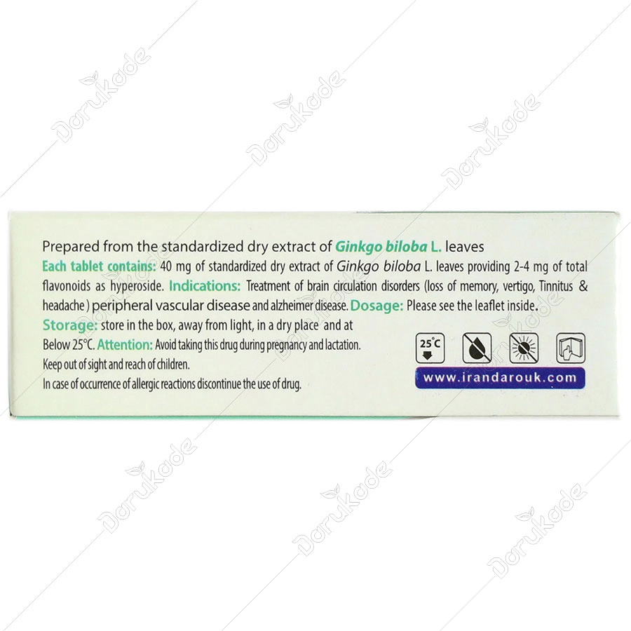 هر قرص حاوی 40 میلی گرم عصاره خشک استاندارد شده گیاه جینکوبیلوبا (Ginkgo Biloba) معادل 4-2 میلی گرم فلاونوئیدهای تام بر حسب هایپروزید می باشد. جینکوبیلوبا گیاهی چینی از تیره Ginkgoaceae است. از عصاره برگ گیاه جینکوبیلوبا برای عوارض ناشی از گردش خون مانند واریس، بواسیر، سردرد، سرگیجه، فراموشی و افسردگی و نیز ضعف بینایی استفاده می شود. نتایج تحقیقات انجام شده نشان می دهد که جینکوبیلوبا در سکته های مغزی، افزایش حافظه، حمله های قلبی، درد ماهیچه های ساق پا به علت واریس و تصلب شراین، ناتوانی جنسی به علت تنگی عروق، درمان آسیب های وارده به شبکه چشم، کری، وزوز گوش، سرگیجه، انقباض برنش در آسم کاملا موثر است.