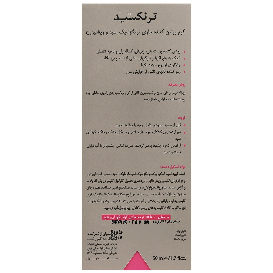 کرم ترنکسید شرکت کیمیا فارمد گیتی گستر با مجموعه کامل از انواع مواد روشن کننده باعث کاهش تیرگی های پوست بدن، پشت دست ها، زیر بغل، کشاله ران و ناحیه تناسلی می شود و به از بین بردن لک های قوی کمک و از تجمع رنگدانه ها به روی پوست جلوگیری نموده و روشنی و شفافیت پوست را در پیش دارد.