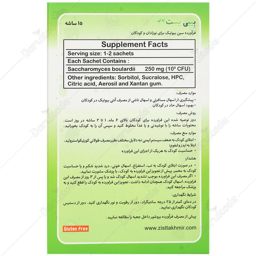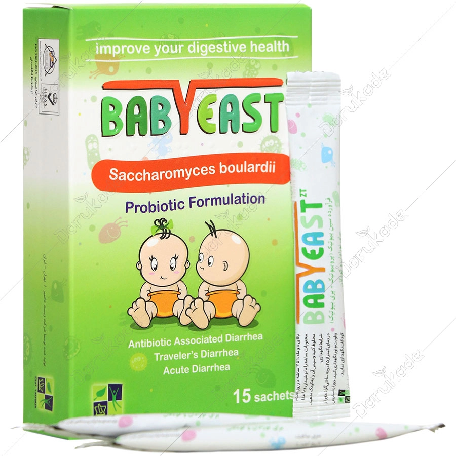 بیبی یست یک ترکیب سین بیوتیک مناسب برای نوزادان و کودکان می باشد و حاوی مقادیر بالایی از باکتری سودمند و ایمن ساکارومایسس بولاردی به همراه مالتودکسترین به عنوان پری بیوتیک است.