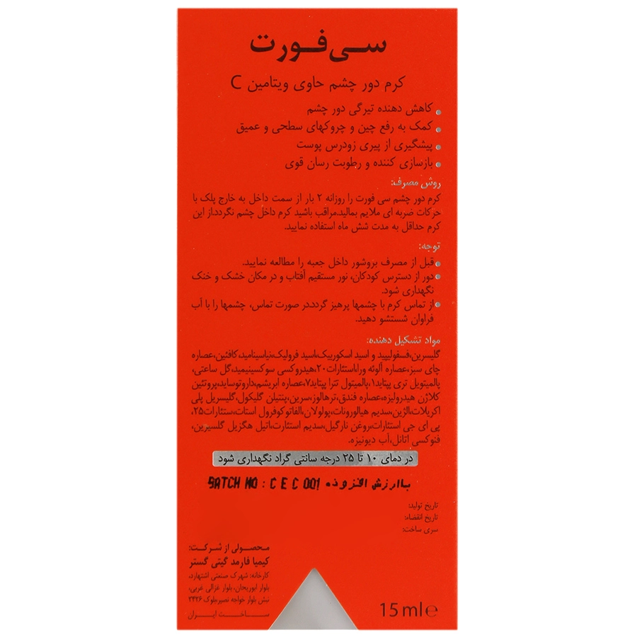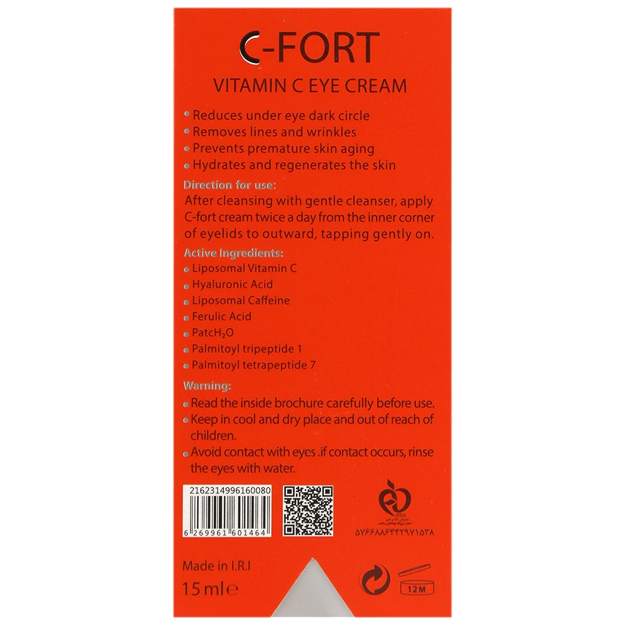 در كرم دور چشم سى فورت درماليفت علاوه بر ويتامين سى از تركيبات و مواد موثره مورد نياز پوست دور چشم استفاده گرديده است. اين كرم علاوه بر خاصيت ضد پيرى و كاهش دهندگى تيرگى، كمك شايانى به افزايش آبرسانى و كاهش خشكى و حساسيت پوست ناحيه دور چشم مينمايد.