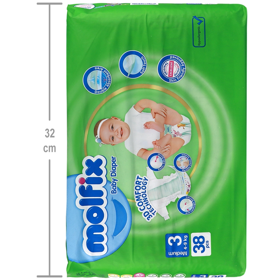 1- پوشک را طوری زیر کودکتان بگذارید تا طرح های جذاب مولفیکس سمت جلوی کودک قرار گیرد 2- دقت کنید تا لایههای محافظ عمودی به سمت داخل تا شده باشد 3- پودر کرم یا روغن بچه هیچگونه اثری روی چسبهای بغل انعطافپذیر مولفیکس که بارها قابل استفادهاند نمیگذارد 4- چسبهای بغل انعطافپذیر مولفیکس را طوری بچسبانید که در هر دو طرف فاصله یکسان باقی بماند