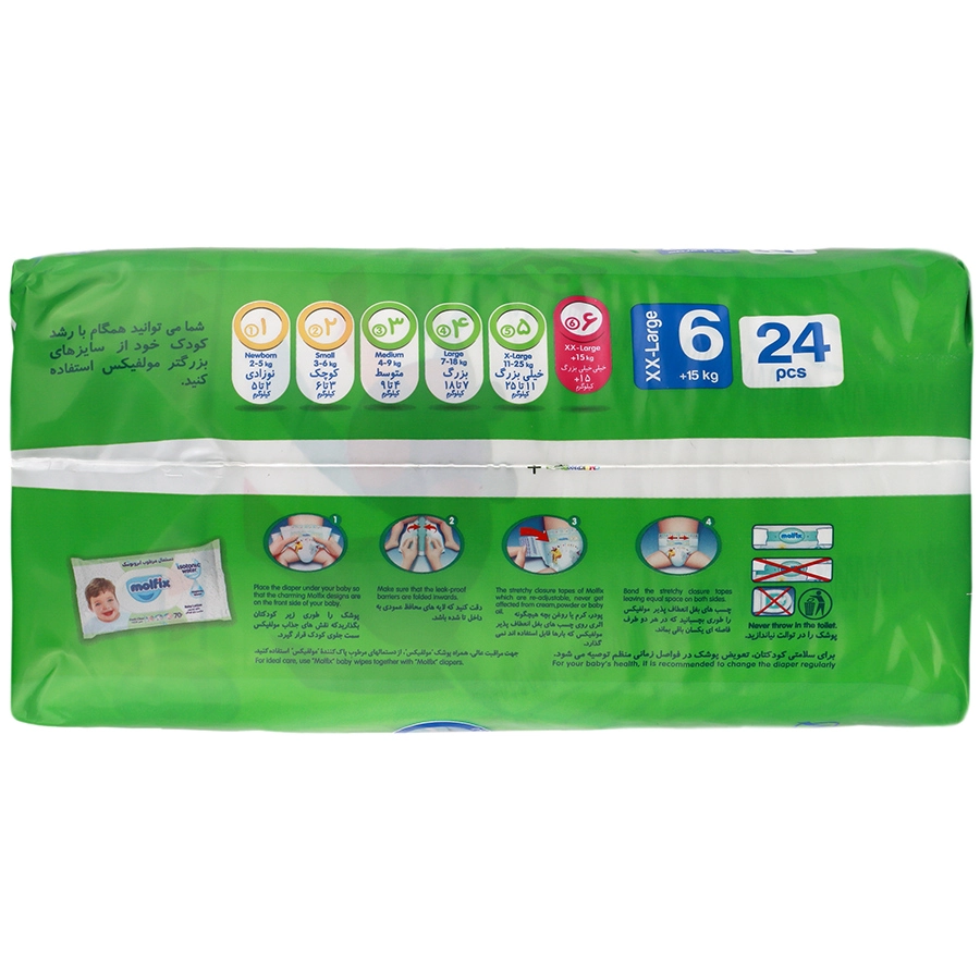 پوشک را زیر بچه بگذارید تا طرح های جذاب آن به سمت جلو باشد. مطمئن شوید که لایههای محافظ عمودی به سمت داخل تا خورده باشند. پودر کرم یا روغن بچه هیچگونه اثری روی چسبهای بغل انعطافپذیر مولفیکس که بارها قابل استفادهاند نمیگذارد. چسبهای بغل انعطافپذیر مولفیکس را طوری بچسبانید که در هر دو طرف فاصله یکسان باقی بماند.