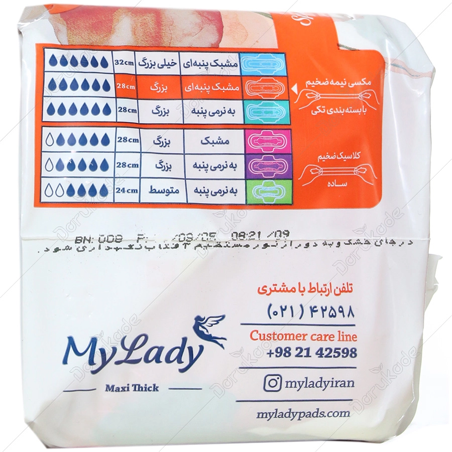 نوار بهداشتی بالدار بزرگ مای لیدی، دارای لایه رویی مشبک به نرمی پنبه برای حس لطافت و خشکی می باشد. این پد نیمه ضخیم بوده و حاوی پودر جاذب با قدرت جذب خیلی خیلی زیاد می باشد.