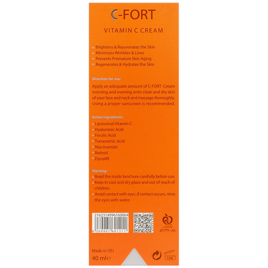 Liposomal Vitamin C: این ویتامین یک آنتی اکسیدان قوی محسوب گردیده و پوست را در برابر رادیکال های آزاد و عواملی که باعث پیری و تیرگی پوست می شوند، محافظت می نماید. در کرم سی فورت از نوع لیپوزومال ویتامین C استفاده گردیده است که علاوه بر پایدار بودن ساختار مولکولی دارای قدرت نفوذ فوق العاده به داخل پوست می باشد. ویتامین C با تقویت ساخت رشته های کلاژن و الاستین باعث افزایش استحکام و خاصیت الاستیسیته پوست می گردد و بعنوان یک جوان کننده قوی باعث رفع چین و چروک های سطحی و عمیق پوست می گردد. این ماده همچنین با مهار آنزیم تیروزیناز در رفع لک ها و تیرگی های پوست خصوصا لک های ناشی از افزایش سن بسیار موثر می باشد.