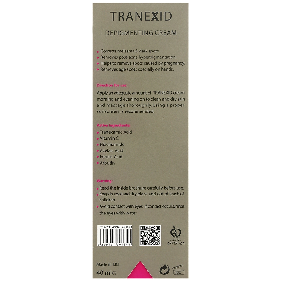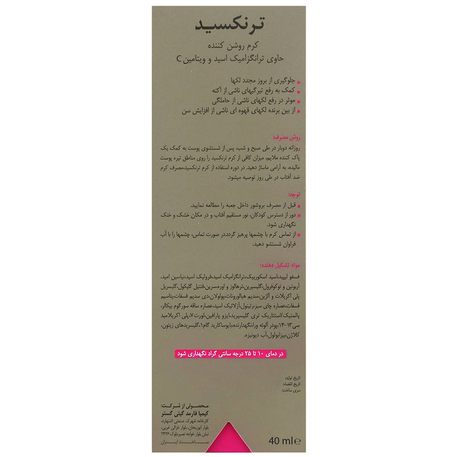 کرم ترنکسید شرکت کیمیا فارمد گیتی گستر با مجموعه کامل از انواع مواد روشن کننده باعث کاهش تیرگی های پوست بدن، پشت دست ها، زیر بغل، کشاله ران و ناحیه تناسلی می شود و به از بین بردن لک های قوی کمک و از تجمع رنگدانه ها به روی پوست جلوگیری نموده و روشنی و شفافیت پوست را در پیش دارد.