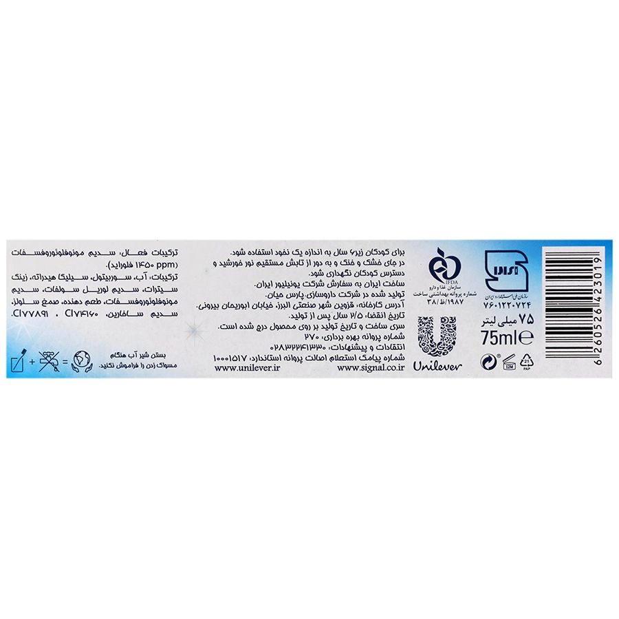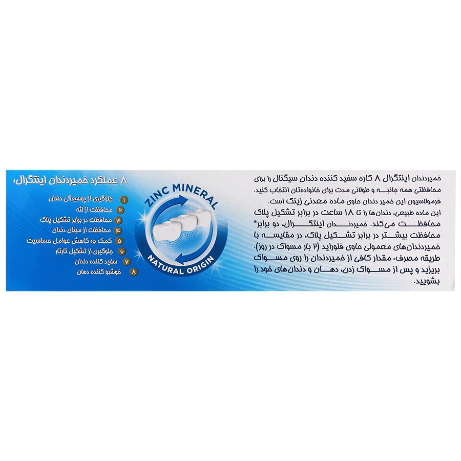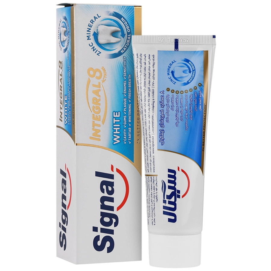 خمیر دندان اینتگرال 8 کاره سفید کننده دندان سیگنال را برای محافظتی همه جانبه و طولانیی مدت برای خانواده تان انتخاب کنید. فرمولاسیون این خمیر دندان حاوی ماده معدنی زینک است.