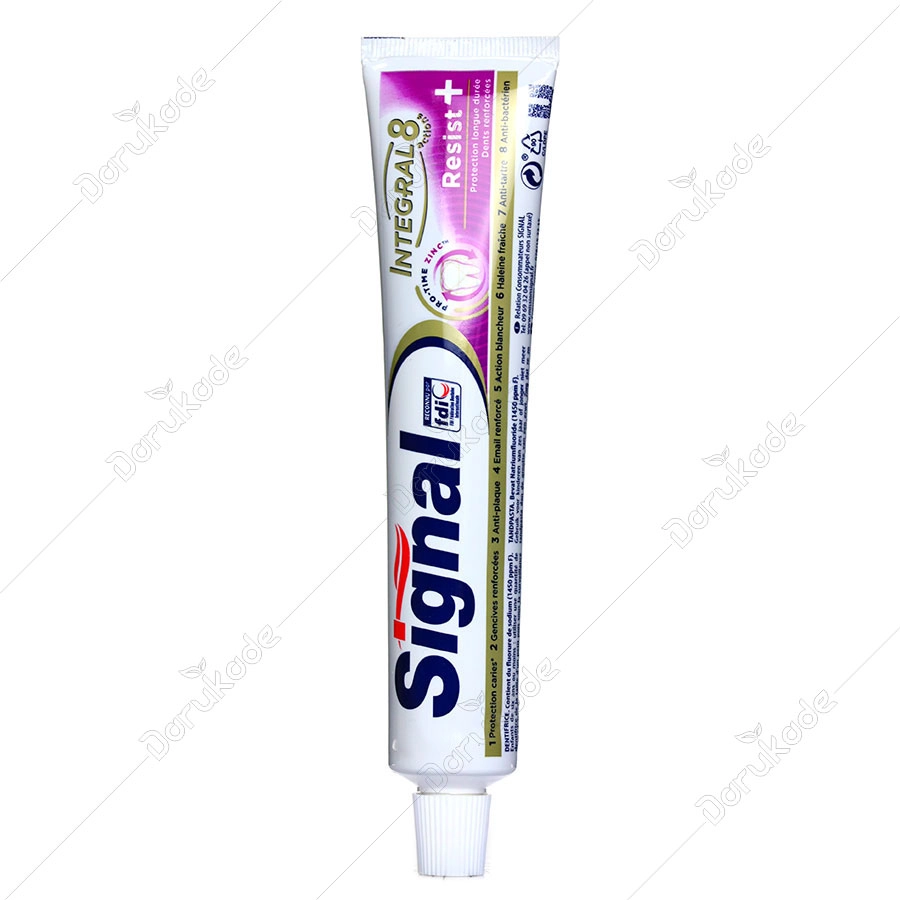 هرچند که عمل مکانیکی مسواک کردن در پاکیزه کردن دندانها و دهان مؤثر است، استفاده از خمیردندان مناسب باعث می شود که محافظت از دندانها و تمیز شدن محیط دهان بهتر و بیشتر انجام شود. خمیردندان اینتگرال 8 سیگنال محصولی است با فرمول پیشرفته مراقبت کامل علیه مشکلات معمول تشخیص داده شده توسط دندانپزشکان . - محافظت از دندان در برابر پوسیدگی - تقویت لثه - آنتی پلاک - محافظ مینای دندان - سفید کننده دندان - خوشبو کننده دهان - آنتی باکتریال 1- کاهش پلاک میکروبی: معمولا خمیر دندانها حاوی موادی هستند که نقش آنها کاهش پلاک میکروبی موجود در سطح دندانها و لثه است خمیردندان ها علاوه بر داشتن مواد ضد میکروبی، با ایجاد کف و همچنین سایشی که به واسطه وجود مواد ساینده ایجاد می نمایند این نقش را ایفا نموده، دندانها را در مقابل تجمع پلاکهای میکروبی و نهایتاً بیماریهای لثه حمایت می نمایند. 2 - خاصیت ضد پوسیدگی: خمیردندان ها علاوه بر کمک به کاهش میکروبهای پوسیدگی زا به علت دارا بودن فلوراید باعث توقف پوسیدگی در مراحل اولیه و استحکام بیشتر مینای دندان و افزایش مقاومت دندانها در مقابل پوسیدگی میشود. این توافق وجود دارد که عنصر فلوراید در خمیردندانها مهمترین و مؤثرترین ماده برای سلامتی دندانها می باشد بنابراین مؤکداً توصیه می گردد افراد بزرگسال از خمیردندانهای حاوی فلوراید استفاده نمایند. بافت اصلی تمام دندانها عاج میباشد که دارای ساختمان میکروسکوپی متشکل از لوله های عاجی است. مواد داخل این لوله ها باعث انتقال حرارت و حس درد می باشند. عاج در قسمت تاج دندان به وسیله مینا و در قسمت ریشه بوسیله سمان پوشیده شده است. اگر به علت پوسیدگی، سایش یا شکستگی تاج، عاج دندان به محیط دهان باز شود به علت ساختمان میکروسکوپیک عاج دندانها حساس میگردد و هر تحریکی باعث درد و ناراحتی میشود. به منظور رفع این مشکل برخی خمیر دندانها حاوی موادی می باشند که با رسوب در محل عاج مدخل لولههای عاج را مسدود می نمایند. تجویز این خمیر دندانها باعث رفع درد حساسیت از دندانهای حساس میگردد. بدیهی است ضرورت دارد اشخاص مبتلا به دندانهای حساس جهت تشخیص قطعی به دندانپزشک مراجعه و مورد معاینه قرار گیرند.