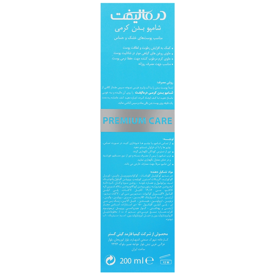 شامپوهای درمالیفت نه تنها فاقد مواد شوینده سولفاته، نمک و پارابن بوده، بلکه دارای پایه ای از اسیدهای آمینه ضروری مورد نیاز پوست و مو می باشد. شامپو بدن کرمی درمالیفت علاوه بر حفظ pH فیزیولوژیک پوست و ترمیم لایه هیدرولیپیدیک، پوست را بدون هیچگونه آسیب رسانی، پاکیزه می کند.