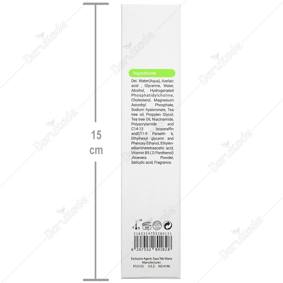 حاوی آزلائیک اسید، نیاسینامید، سالسیلیک اسید، گلیسیرین، روغن درخت چای، ویتامین B5، پودر آلوئه ورا