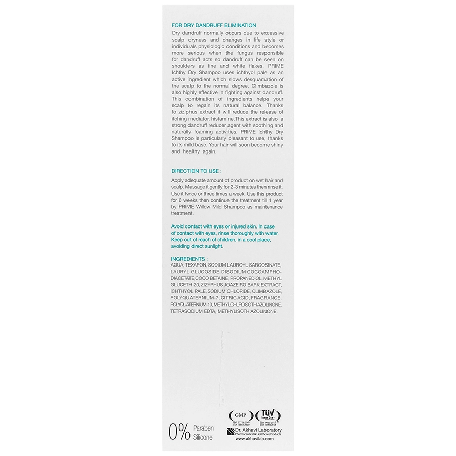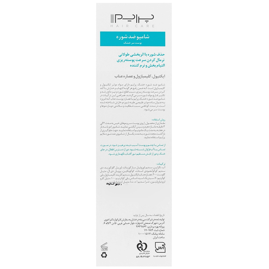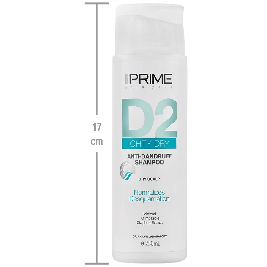 شامپو ضد شوره خشک پرایم دارای مواد موثر ایکتیول و کلیمبازول است که ضمن رفع هر گونه التهاب و خارش، با کند کردن سرعت پوسته ریزی، سبب قطع شوره و نیز مانع رشد و تکثیر قارچ مولد شوره سر می گردند. همراهی این ترکیبات در شامپو ضد شوره خشک پریم با عصاره پوست عناب که امروزه به عنوان ماده موثر طبیعی علیه شوره و خارش شناخته شده است، در مدت کوتاهی سبب شفافیت و سلامتی دوباره موها و پوست سر می شود.
