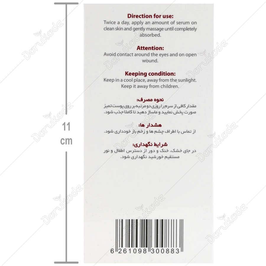 مقدار کافی از سرم را روزی دو مرتبه بر روی پوست تمیز صورت پخش نمایید و ماساژ دهید تا کاملا جذب شود.