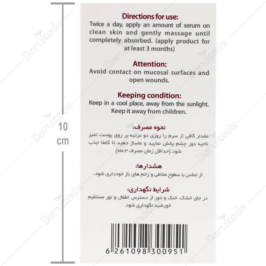 مقدار کافی از سرم را روزی دو مرتبه بر روی پوست تمیز ناحیه دور چشم پخش نمایید و ماساژ دهید تا کاملا جذب شود. (حداقل زمان مصرف 3 ماه)