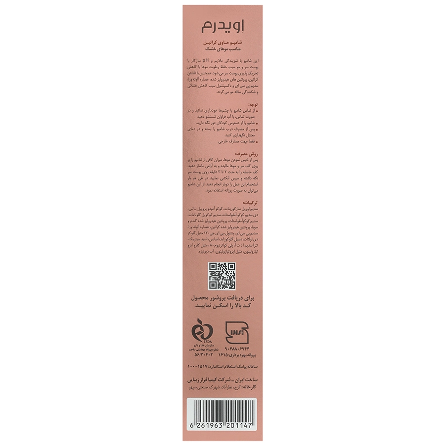 شامپو Sulfate Free و فاقد سدیم کلراید اویدرم حاوی عصاره های گیاهی، دکسپانتنول و گلیسیرین می باشد. در این شامپو سورفکتانت های ملایم و در عین حال موثر جایگزین ترکیبات سولفاته و آنیونی شده اند که بسیار ملایم، مطمئن و مناسب موهای کراتینه شده بوده، هیچ گونه آسیبی به موها وارد نمی کنند. این محصول به ویژه برای افرادی که موهای کراتینه، آسیب دیده و یا حساس دارند و همچنین کسانی که به استحمام روزانه عادت و نیاز به شوینده های ملایم دارند کاملا مناسب است.