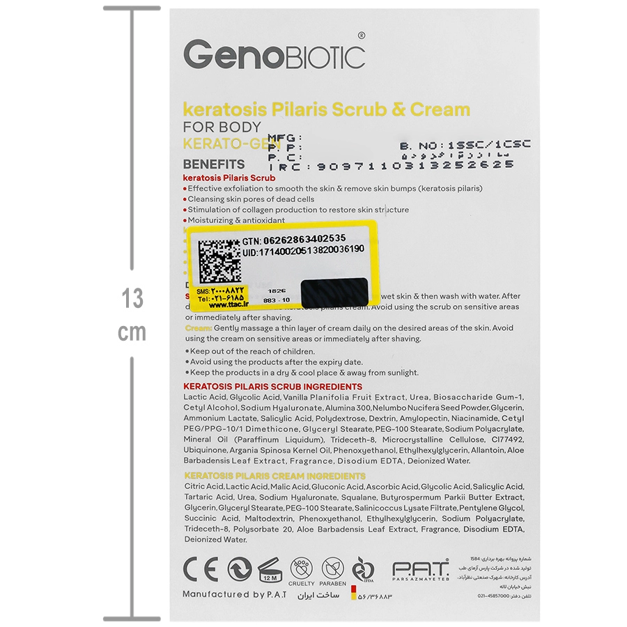 اسکراب پوست مرغی: اسکراب را 1 یا 2 بار در هفته بر روی پوست مرطوب ماساژ دهید و سپس با آب بشویید. پس از خشک کردن، از کرم کنترل کننذه پوست مرغی ژنوبایوتیک استفاده نمایید. از مصرف اسکراب بر روی نواحی حساس یا بلافاصله پس از اصلاح بپرهیزید.