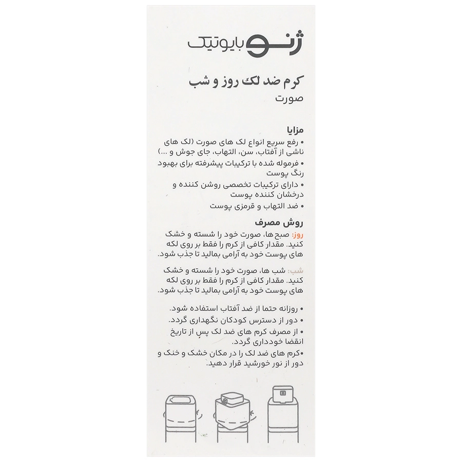 محصول ضد لک ژنوبایوتیک، به صورت دو کرم تخصصی روز و شب طراحی شده است که مکمل یکدیگر بوده و برای درمان انواع لک، موثر هستند. آربوتین و کوجیک اسید موجود در این کرم از فعالیت آنزیم تیروزیناز و تولید ملانین در پوست جلوگیری کرده و پوست را عاری از لک می کند. انواع لایه بردار ها با قدرت ملایم تا قوی در این محصولات استفاده شده است تا ناحیه لک را از سلول های مرده و لک به جا مانده بر روی پوست، پاکسازی کنند.