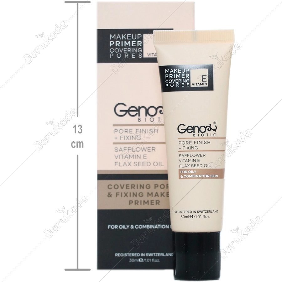 مقدار کمی ازپرایمر صورت ژنوبایوتیک را برداشته و آن را با نوک انگشت و با حرکت نرم و چرخشی به طرف بیرون صورت خود بمالید. بگذارید پرایمر کاملا خشک شود.
