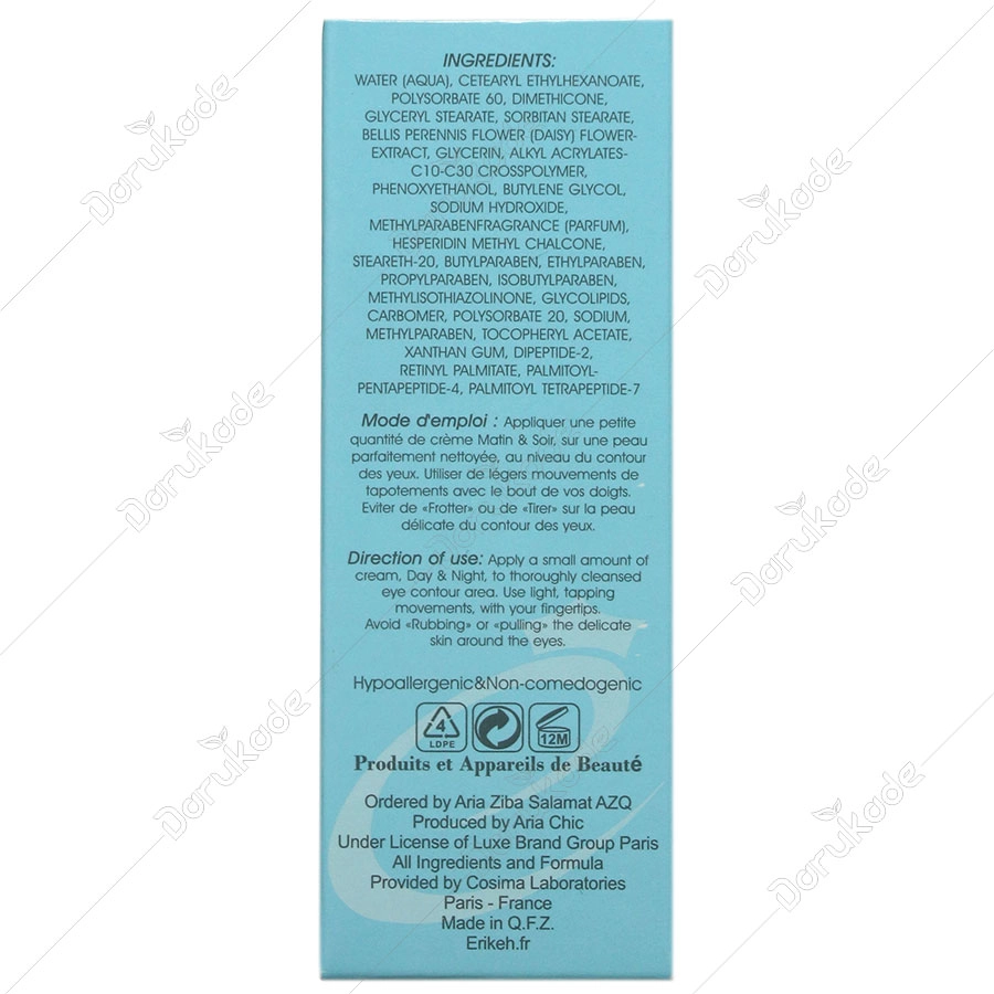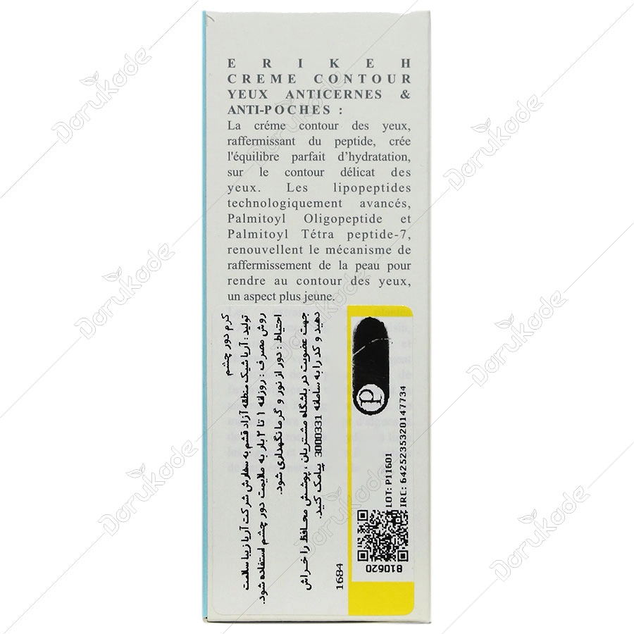 کبودی و تورم زیر چشم چهره را پیر و خسته به نظر می رساند. کرم ضد پف و کبودی دور چشم اریکه بوسیله خصوصیات زیر این دو مشکل را برطرف کرده ، چهره را جوان و شاداب می کند. ترکیبات موثر با منشاء گیاهی موجود در این کرم نفوذپذیری مویرگی را کاهش داده ، نشت مایعات را به فضای بین سلولی محدود کرده و در نتیجه ، تورم را کاهش می دهد. این محصول حاوی ترکیبات جدید گیاهی است که خاصیت روشن کنندگی داشته و کبودی دور چشم را به نحو موثری کاهش می دهد. ترکیبات ضد التهاب موجود در این کرم التهاب موجود را از بین برده ، خستگی چشمان شما را برطرف می کند. مواد محرک تولید کلاژن و الاستین موجود در این محصول ، استحکام پوست این ناحیه را افزایش داده ، به آن قوام می بخشد و از ایجاد چین و چروک پیشگیری می کند. مشتقات ویتامین E موجود در این کرم آسیب های محیطی را خنثی می کند. چربیهای ضروری پوست موجود در این محصول ، مشکل عدم تولید چربی در پوست دور چشم را برطرف و آنرا نرم و لطیف می کند. خواص ضد تورم این کرم ، ورم اطراف چشم ها ، که از عوامل اصلی خسته و پیرتر به نظر رسیدن چهره است را از بین می برد. پروتئین های موجود در این محصول منبع سرشاری از اسیدهای آمینه مورد نیاز سلولهای پوست برای بازسازی هستند.