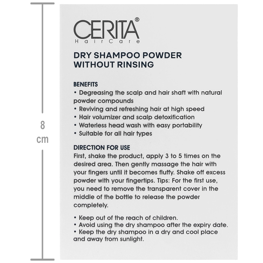 از ترکیبات گیاهی و کائولین برای جذب چربی کف سر و تمیزی موها، در شامپو خشک پودری سریتا استفاده شده است که رطوبت رسانی مناسبی هم به کف سر انجام می دهد. همچنین عصاره گیاه بشقابی موجود در این محصول ضد خارش و ضد التهاب است و آزردگی های کف سر را برطرف می کند.