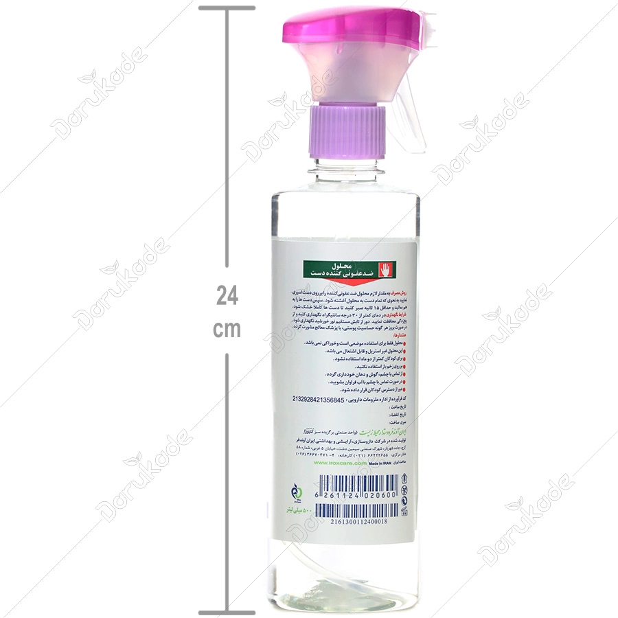 به مقدار لازم محلول ضد عفونی کننده را بر روی دست اسپری نمایید به نحوی که تمام دست به محلول آغشته شود. سپس دست ها را به هم بمالید و حداقل 15 ثانیه صبر کنید تا دست ها کاملا خشک شود.
