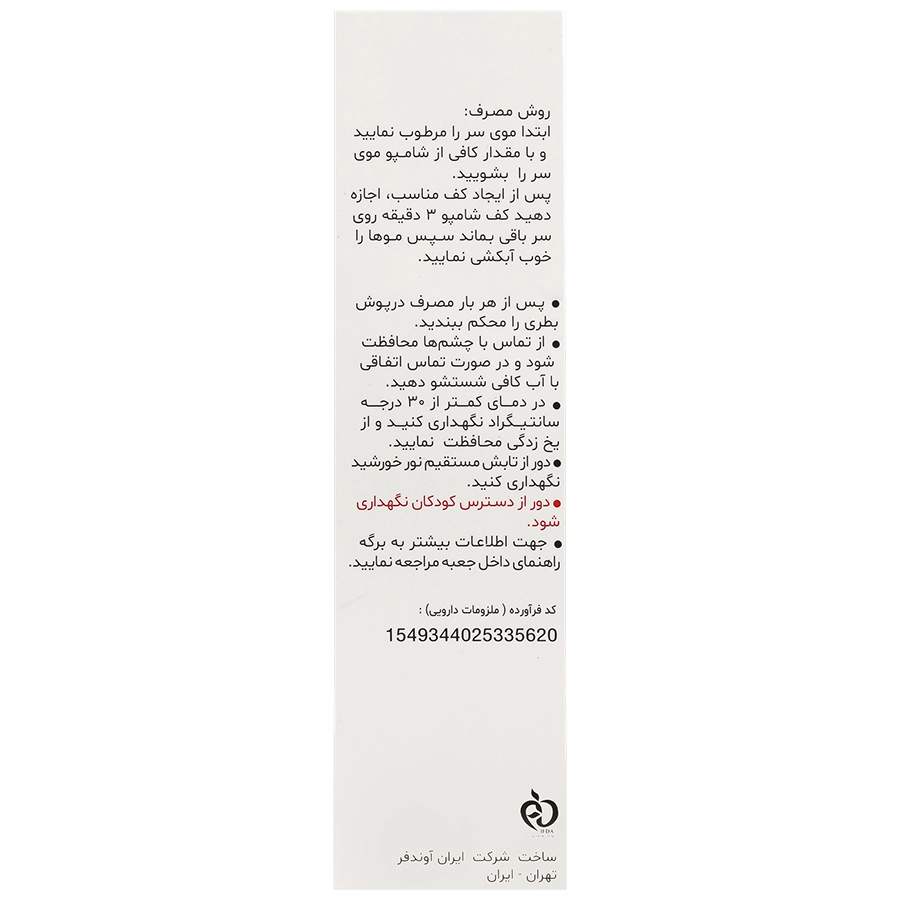 ابتدا موی سر را مرطوب نمایید و با مقدار کافی از شامپو موی سر را بشویید. پس از ایجاد کف مناسب، اجازه دهید کف شامپو 3 دقیقه روی سر باقی بماند سپس موها را به خوبی آبکشی نمایید.